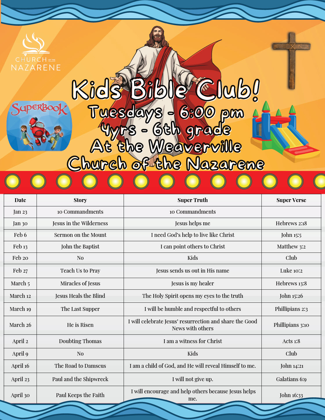 Kid's Bible Club is two hours of fun beginning at 6pm! It is free of charge and it meets in the sanctuary building of Weaverville Church of the Nazarene!