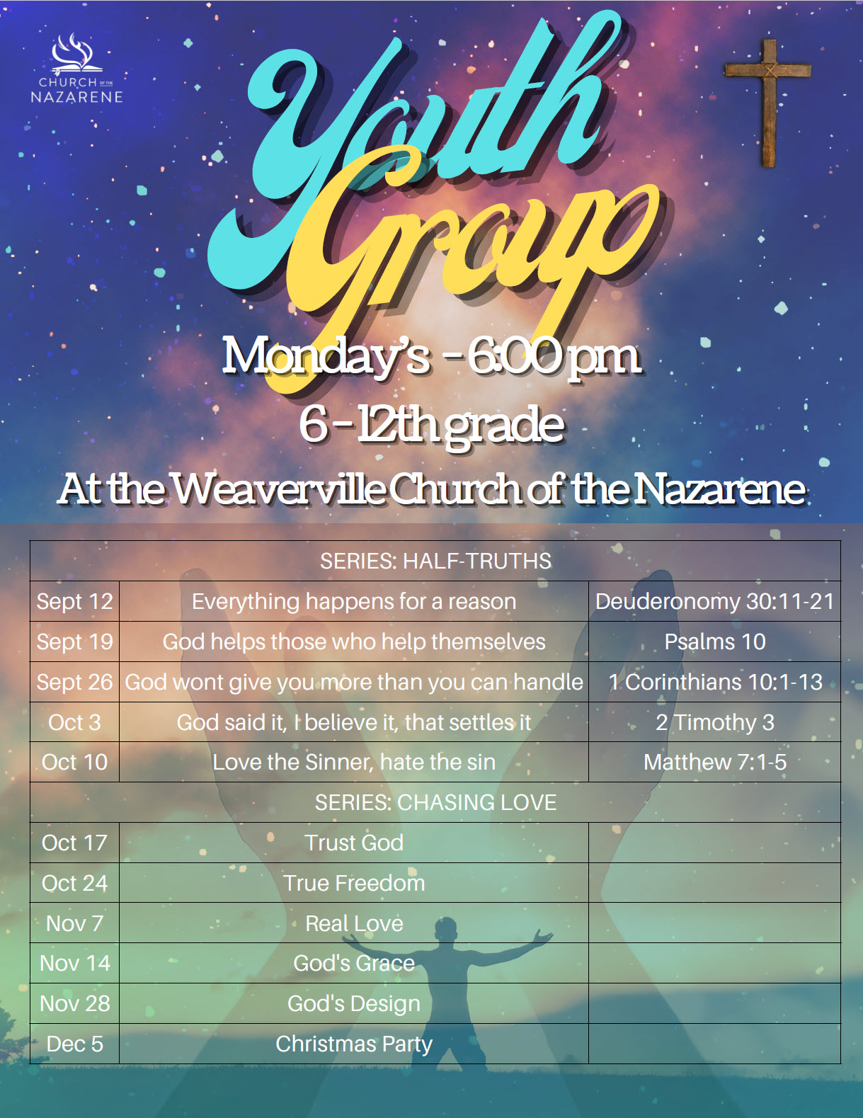 Our Fall and Spring meetings occur on Mondays from 6 to 8pm. We meet in the Sanctuary of Weaverville Church of the Nazarene. The age range for Youth Group begins in 6th grade and goes through 12th grade.